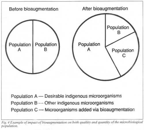 Products Typical bioaugmentation products consist of blends of several strains of microorganisms, usually bacteria or fungi. The organisms are isolated from nature and are not genetically altered in any way. They are selected on the basis of accelerated reproduction rates and their ability to perform specific functions, such as good floc-forming capabilities to enhance settling or the ability to degrade specific compounds. The products are sold in a variety of forms, with dried organisms on a bran carrier and liquid products being the two most common. Product selection for a particular application is based on a combination of laboratory treatability studies and field experience in similar applications. Plant samples of wastewater influent and aeration basin biomass are sent to the laboratory for product screening and treatability work. Typically, one week is required to complete the laboratory work. In some cases, where the plant is in danger of permit violation, program implementation must begin prior to lab work completion. In these cases, the experience from similar application is critical in determining the initial course of action. The lab work will be run concurrently with program implementation and utilized to make adjustments in the program, if necessary. More Than Just Products Successful bioaugmentation requires total system management. If the microbiological population can be viewed as a workforce, then the consultant or system manager is responsible for keeping the workforce productive. The system manager must provide an acceptable work environment by controlling the key system parameters such as PH, temperature and oxygen levels. He must compensate them with nutrients to ensure good growth and a healthy population. He has to know when to lay-off workers through wasting to keep the population young and vital. Finally, the successful system manager knows when to hire new workers to provide special skills not found in his workforce. Bioaugmentation is the mechanism to provide these skilled workers. A critical part of the success of a bioaugmentation program is proper application. Because every system is unique, it is essential that products are properly applied. Bioaugmentation programs should be implemented with the help of surveying the total system, assessing the best solution to the problem and documenting the impact of the program. Simply dumping a product into the influent is not bioaugmentation. |