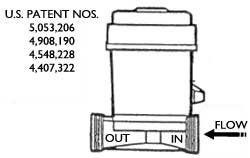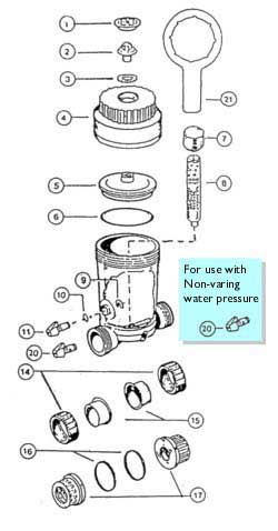 When used on a constant pressure and flow it is necessary to replace the valve (No. 11). Replace it with the optional adjustable valve (No. 20). It may be necessary to install the optional screen filters (No. 19) in the top inside hole of (No. 8) and screen (No. 18) in the adjustable inlet hole when using chemicals other than chlorine. When using the unit for constant pressure and flow such as a sprinkler system or pool; install the unit on the output to the sprinkler heads or on the return line to the pool. The adjustments for the varying pressure system should have no holes shown through in the off position. The amount of chemical dispensed is controlled with the adjustable valve on the outside of the unit. It may be necessary to adjust the unit if flow is increased or decreased.