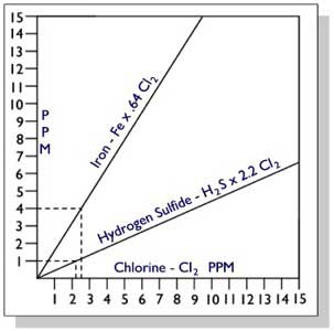Example: 20 PPM H2S x 2.2 Cl2 = 44 PPM of Cl2. 20 PPM Fe x .64 Cl2 = 12.8 PPM of Cl2