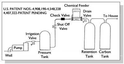 If using a 42 gallon pressure tank, the No. 2 hole on the chemical feeder should be used. This will dispense about 8PPM of Cl2, and a filter with 1 cube of activated carbon after the unit will eliminate the excess Cl2. If using the chemical feeder for iron removal or extremely high H2S, it is necessary to use a retention tank and a back washing valve on the carbon filter.