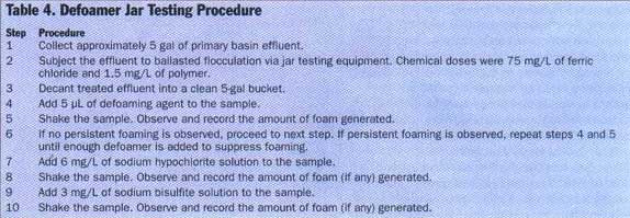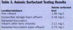 ..... In an attempt to quantify the surfactants in the plants influent, samples were sent out for anionic surfactant tests. Raw influent, excess-flow storage basin effluent, ballasted flocculation basin influent (after ferric chloride addition), and ballasted flocculation basin effluent were tested. .....Results indicated that anionic surfactant levels at all locations were very low, under 3 mg/L (normal levels for wastewater are 1 to 20 mg/L; see Table 3, above). Unfortunately, the results did not provide any more infor- mation, for several reasons. First, the surfactants my not be anionic. Second, if several surfactants are present, anionic surf actant tests will be inaccurate because of interference from other surfactants. Third, city staff did not know any industry that could be discharging a high level of surfactants to the treatment plant, making it impossible to identify the surfactants source. Hunting for Solutions .....To alleviate the ballasted flocculation foaming problems, two treatment alternatives were developed using alter native coagulants at various doses and adding defoaming agents to ballasted flocculation basin effluent. Unfortunately, testing with different coagulants (including ferric sulfate, aluminum sulfate, and polyaluminum chlorohydrate) at varied doses resulted in significant foaming. .....Testing with defoaming agents proved more successful. Initial jar tests used a defoamer (Drewplus A-8274) and common vegetable oil (soybean). Both the defoamer and the vegetable oil controlled foam immediately. Sodium hypochlorite was added to ensure that foaming would not occur after disinfection. Samples with and without the defoaming agent were tested for BOD to show the effect of the agent. Initial tests indicated that the agent did not affect BOD limits.
