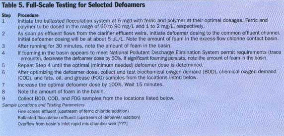 .....All jar testing was conducted using plastic equipment (jar testing vessels, sample containers, etc.) because plastics are most likely to support worst-case foaming conditions (surface tension, static charge, etc see Table 4, p. 34). The project team hoped that lower dosages of defoaming agent would be effective in the full-scale ballasted flocculation system, given its concrete chambers and stainless steel equipment, but full-scale testing at a flow rate of 7600 m3/d (2 mgd) showed that the higher doses were necessary. .....So, the project team contacted other chemical companies to find several comparable defoamers that could control the foam at lower dosages and to determine the best place to add defoamer. Five locations were reviewed: before the ferric chloride dosage point, in the ballasted flocculation basin, at the ballasted flocculation effluent discharge point, after chlorination at the excess-flow chlorine contact basin, and after dechlorination but before blending with the plants effluent. ..... More than 10 defoaming agents were tested on ballasted flocculation effluent with doses of 75 mg/L and 1.5 mg/L of ferric chloride and polymer, respectively.